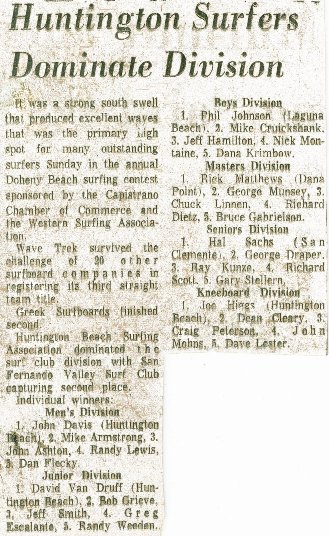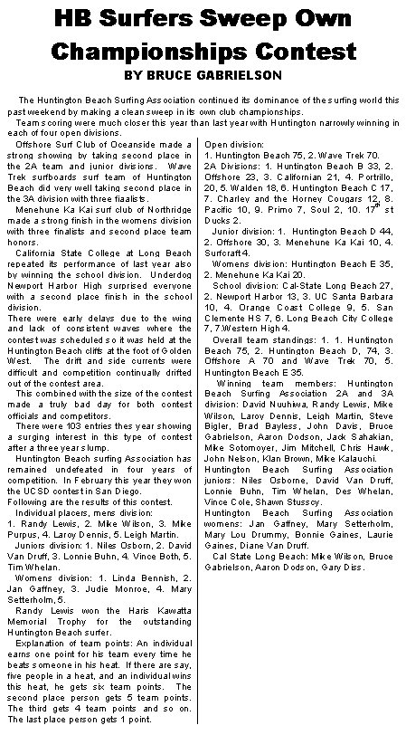 HBSA dominated the meet, much to the consternation of the locals who managed to get all US surfers barred from surfing at the Cannery shortly thereafter. Bruce also personally got into a lot of hot water from Huntington Beach High School officials as a result of this trip.