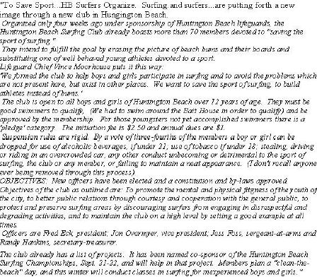In the same edition, in the "Street Scene" section of the paper is reads: "The back cover of the July 'Surfing Guide' magazine featuring the entire back page with a style plate picture taken at the Huntington Beach pier of male models. Don Shusta, Richard Scott, Steve Harrington and Jess Foss...Inside photos of pier surfers in action included...Rich Chew, John Peck, Roy Crump, Jim Richards, Denny Buell, et al." Most of these surfers, too, were part of the club.