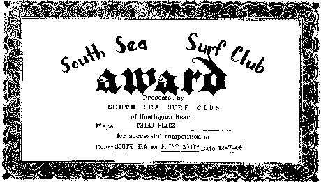 Clubs that emerged in other areas included Newport Beach Surfing Association, Laguna Beach Surfing Association, San Clemente Surf Club, Point South Surf Club, Bay Cities Surf Club (and Hermosa Beach Surfing Association in the late 60's), Malibu Surf Club, Wind and Sea Surf Club, and Menehune Ka Kai of Northridge also existed in other parts of Southern California. The figure shows an award Bruce Gabrielson won in a meet between South Sea Surf Club and Point South held at the HB Cliffs dated December 7, 1966.