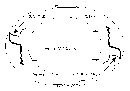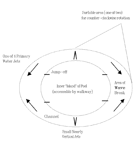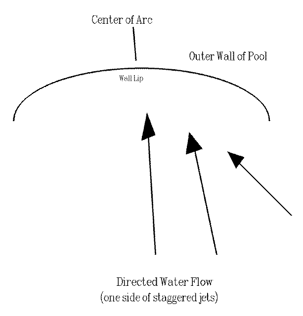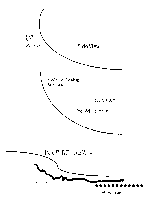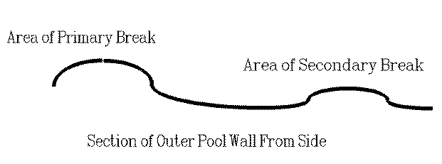 Jets of water impacting the uniquely curved pool wall from various angles as shown in Figures 3 and 4, will create a shaped breaking wave on the upper section of the moving wall of water. Figure 5 shows the outer top of the pool wall, with the area of the primary break and the area of the secondary break higher than other parts of the wall. These areas will also be slightly deeper than other areas of the pool.