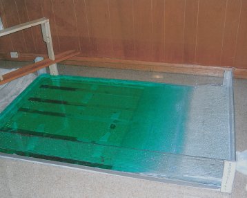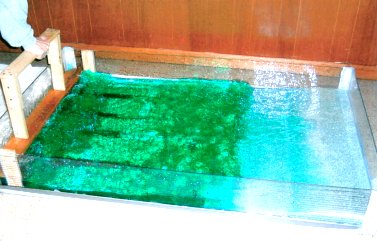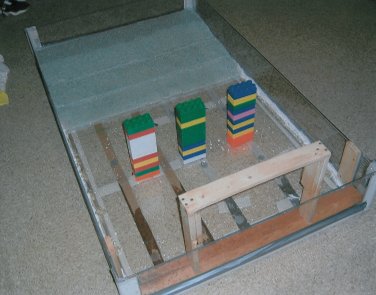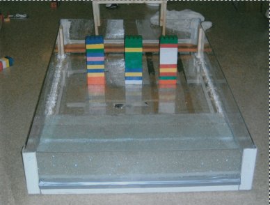 The pictures below are from Pam Shea who built one of these pools for her son's school project. I like them better then pictures of my pool since this pool was built of plexiglass and wave action and underwater structures are clearly visible. The drawback of using plexiglass is that you can't simply lift the pool up to quickly drain it or it will spring a leak. I need to empty and remove my pool very quickly after demonstrations.