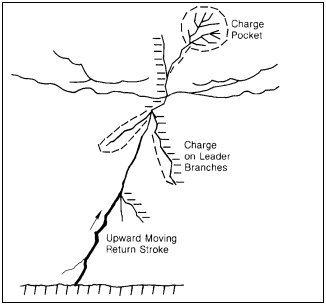 The lightning strike process of concern to engineers is better understood than the charging mechanics involved [5], and is shown in Figure 2. As the leader approaches an aircraft, corona effects, called streamers, are simultaneously generated from opposite ends of the vehicle. Once these streamers attach to the stepped leader, the air breakdown potential between the vehicle and ground is exceeded and the channel is completed to ground. The first return stroke neutralizes the immediate charge center initiating the leader, with subsequent strokes neutralizing other nearby charge centers of insufficient strength to initiate their own discharge independently.